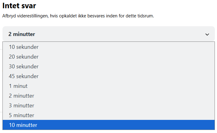 - Hvis du vælger, at opkald ved “intet svar” skal gå til en telefonmenu, til en telefonkæde eller til en ringegruppe, så vil din kundes opkald være aktiv i max 10 minutter, før det afsluttes.
